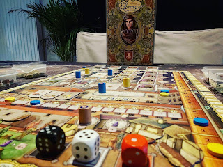 Lorenzo Il Magnifico, 1 van de spellen die we meenamen van Spiel Essen '19. Toen konden we de Duitse versie erg goedkoop vinden, spel is taalonafhankelijk. De Engelstalige regels zijn ook makkelijk te vinden. De Engelstalige appendix met de uitleg van de excommunicatietegels en de leadercards was een zoektocht. Gelukkig intussen in bezit, dus we konden het spel uittesten.