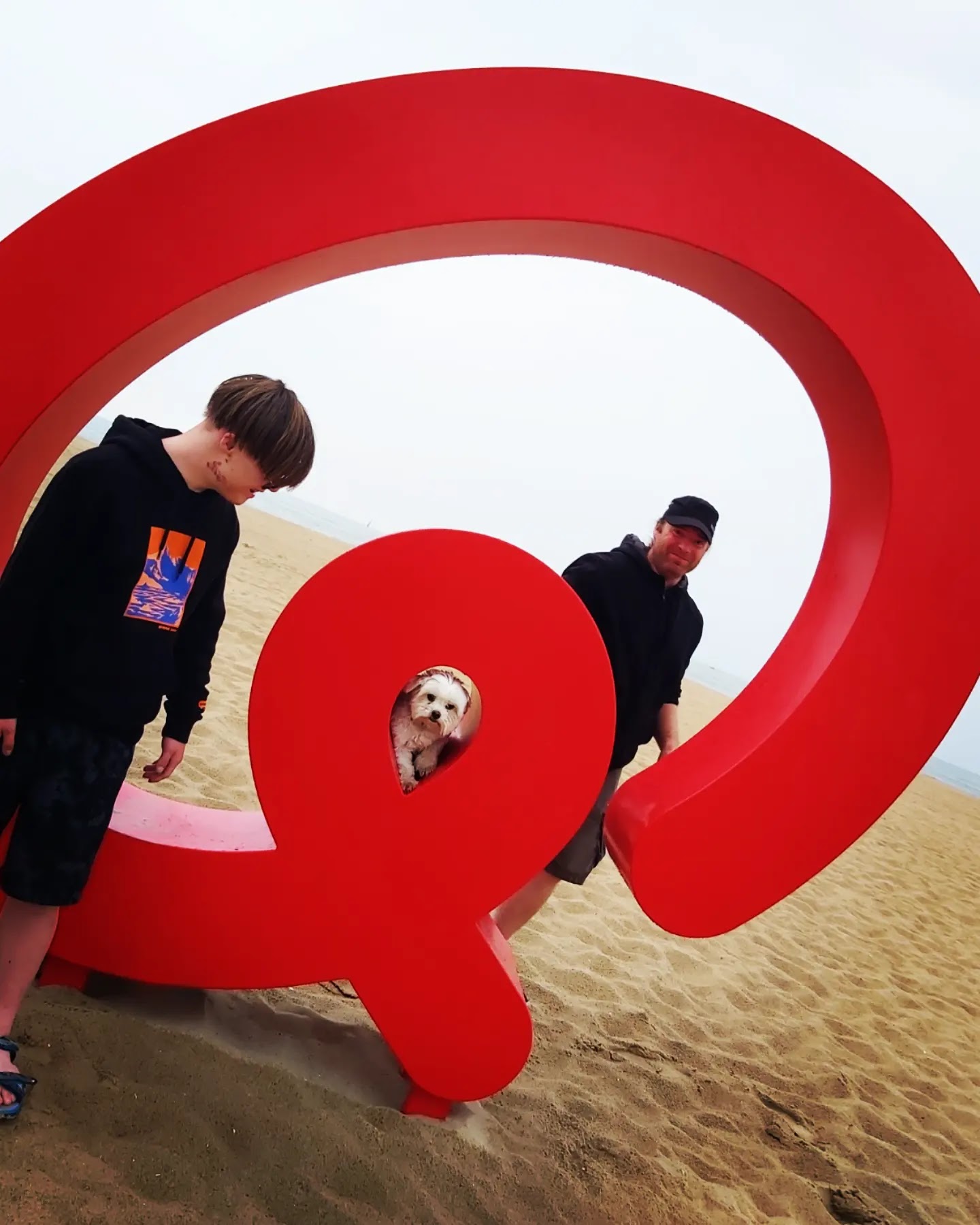 Eerste avond aan zee. Na een hele dag regen dan toch even droog, dus we gaan voor een avondwandeling op het strand. De Q-beach-house is vlakbij en dan kunnen we al eens een Q-foto nemen. P denkt er het zijne van...